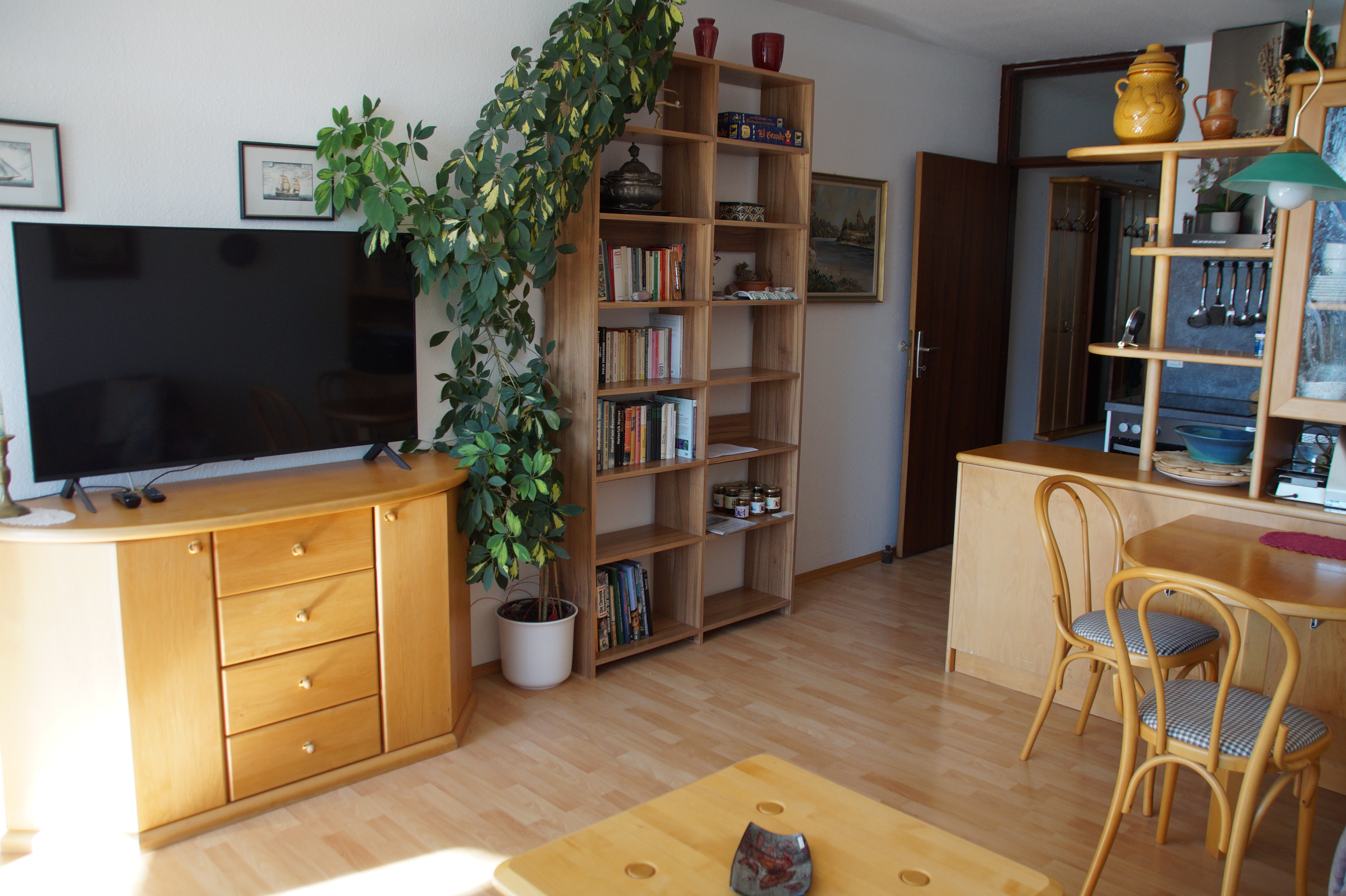 Wohnraum: Küche, Essecke, (Schlaf)-Sofa, SAT-Fernseher